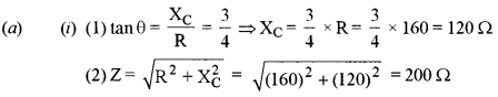 (a) An alternating emf of 220 V is applied to a circuit containing a resistor R having resistance of 160 Ω and a capacitor C’ in series. The current is found to lead the supply voltage by an angle 0 = tan-1 (3/4).