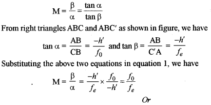 The object subtends an angle a at the objective and would subtend essentially the same angle at the unaided eye. Also, since the observers’ eye is placed just to the right of the focal point F2‘, the angle subtended at the eye by the final image is very nearly equal to the angle p. Therefore,