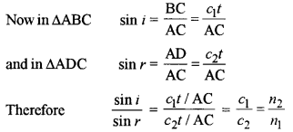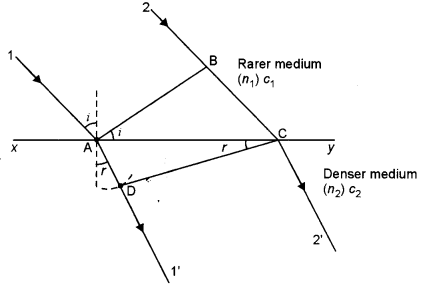 According to Huygens’s principle point A meanwhile begins to act as secondary source of light and secondary wavelets from it will cover a distance c2t in second medium in time t. Draw a circular arc with A as center and c2t as radius and draw a tangent CD from point C on this arc. Then CD is the refracted wave front, which advances in the direction of rays 1,2. The refracted wave front subtends an angle r from surface XY.