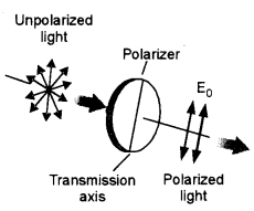 (ii) Figure shows an unpolarised light beam incident on the first polarizing sheet, called the polarizer where the pass axis is indicated by the straight line on the polarizer. The polarizer can be a thin sheet of tourmaline (a complex boro-silicate). The light, which is passing through this sheet, is polarized vertically as shown, where the transmitted electric vector is E0.