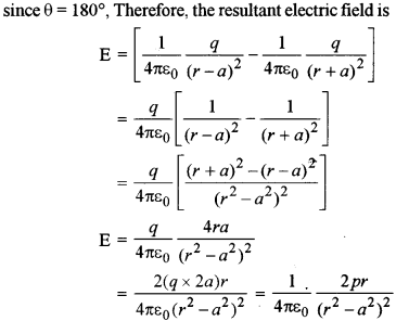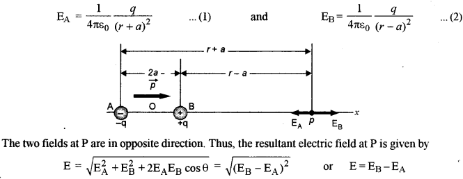 Consider an electric dipole consisting of – q and + q charges separated by a distance 2a as shown in. figure below. Let P be the point of observation on the axial line where the electric field has to be found. Let it be at a distance r from the center O of the dipole. Let us suppose that the dipole is placed in vacuum.