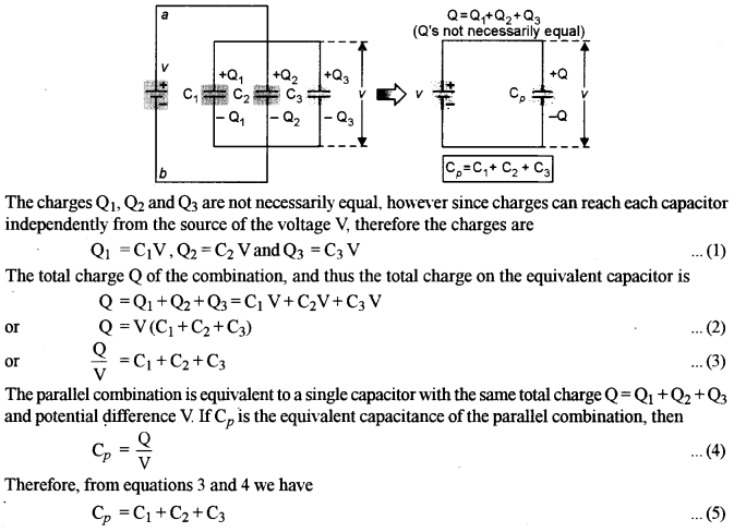 Consider two capacitors connected in parallel between points ‘a’ and b having capacitance C1, C2 and C3 as shown in figure. In this case the upper plates of the three capacitors are connected together by conducting wires to form an equipotential surface, and the lower plates form another. Hence in parallel combination the potential difference for all individual capacitors is same and is equal to V.