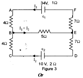 (a) ∈1 and ∈2 are two batteries having emf of 34 V and 10 V respectively and internal resistance of 1 Ω and 2 Ω respectively. They are connected as shown in Figure 3 below. Using Kirchhoff’s’ Laws of electrical networks, calculate the currents I1 and I2.