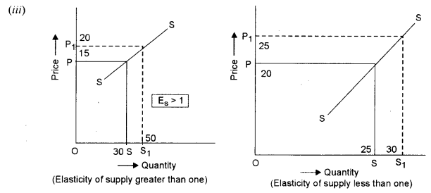 (iii) Draw two supply curves, the first one showing elasticity of supply greater than one and the second one showing elasticity of supply less than one.