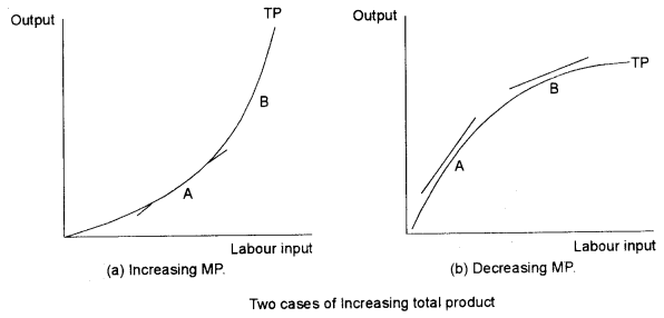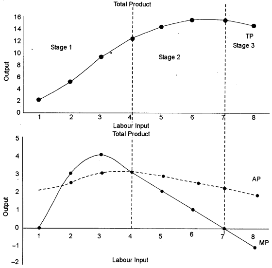 (c) ‘If more variable factors are employed with fixed factors, the total product increases at an increasing rate and finally, it falls’. Explain the three stages of the Law with the help of TP, AP and MP curves. [6]
