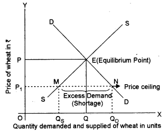 As wheat is an essential commodity, the government interferes and fixes the maximum price (known as Price ceiling) at OP1 which is less than the equilibrium price OP.