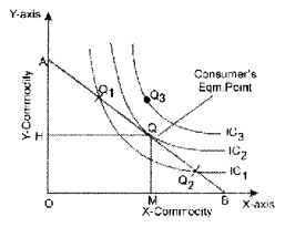 The point where these two conditions are fulfilled simultaneously represents eqm. for the consumer because that relates to the highest indifference curve that consumer can reach within his available budget. It can be shown with the help of the following diagram: It is clear from the figure that ‘Q’ is the only eqm. point where both the conditions of eqm. are fulfilled. Where the consumer buys ‘OM’ of X Commodity and ‘OH’ of Y Commodity. Any other point-like and Q2 cannot be considered as an optimum point because they lie on a lower indifference curve IC. Any point lying on IC3 like ‘Q3’ is beyond the reach of the consumer and no eqm. condition is satisfied.
