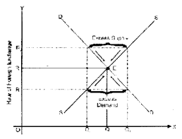 The equilibrium exchange rate is determined at a level where the demand for foreign exchange is equal to the supply of foreign exchange. This will be clear from As seen in the diagram, demand and supply of foreign exchange are measured on the X-axis whereas the rate of foreign exchange on the Y-axis. DD is the downward sloping demand curve of foreign exchange and SS is the upward-sloping supply curve of foreign exchange. Both the curves intersect each other at point ‘E The equilibrium exchange rate is determined at OR and the equilibrium quantity is determined at OQ.