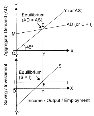 (c) Explain the determination of the equilibrium level of output with the help of saving and investment curves. If savings exceed planned investment, what changes will bring about equality between them?