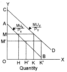 MUX/PX is equal to OM. when OH amount of good X is purchased. MUY/PY is equal to OM. w hen OK quantity of good Y is purchased. Thus, when the consumer is buying OH of X and OK of Y then MUX/PX = MUY/PY = MUM.
