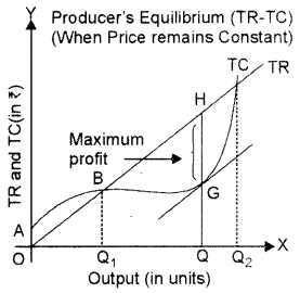 Producer’s equilibrium (when prices remain constant): When price remain same at all output levels, each producer aims to produce that level of output at which he can earn maximum profits, i.e., when the difference between TR and TC is maximum.