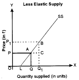 (iii) Less Elastic Supply (Es < 1): If a supply curve meets the X-axis at some point, say, L in Fig., then supply is inelastic. As seen in the fig., Es = \(\frac { LQ }{ OQ }\) and LQ < OQ. So, Es < 1, i.e. supply is less elastic.