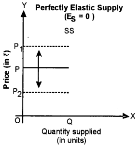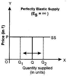 (iv) Perfectly Elastic Supply: When there is an infinite supply at a particular price and the supply becomes zero with a slight fall in price, then the supply of such a commodity is said to be perfectly elastic. In such a case Es = Y and the supply curve is a horizontal straight line parallel to the X-axis, as shown in fig.