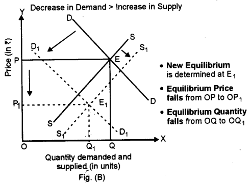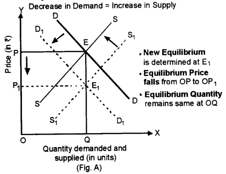 (Fig. A). The new equilibrium is determined at E1. As the decrease in demand is proportionately equal to the increase in supply, equilibrium quantity remains the same at OQ, but equilibrium price falls from OP to OP1.