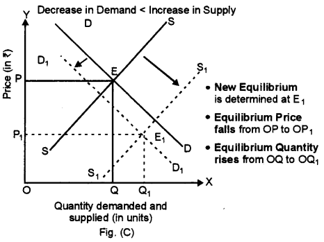 (i) When the decrease in demand is proportionately less than an increase in supply, then leftward shift in demand curve from DD to D1D1 is proportionately less than a rightward shift in supply curve from SS to S1S1 Fig. C). The new equilibrium is determined at E1. As the decrease in demand is proportionately less than the increase in supply, equilibrium quantity rises from OQ to OQ1 whereas, equilibrium price falls from OP to OP1.