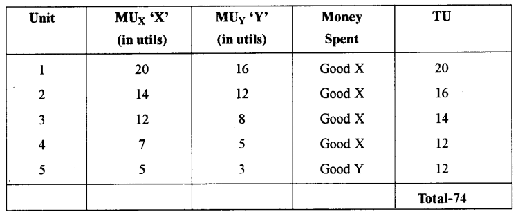 The total satisfaction of 74 utils will be obtained when a consumer buys 3 utils of ‘X’ and 2 units of ‘ Y’. It reflects the state of the consumer’s equilibrium. If the consumer spends his income in any other order, total satisfaction will be less than 74 utils.