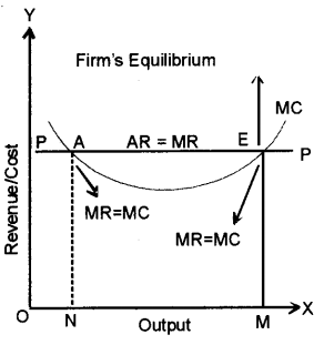 On the other hand, point E show s that the firm is producing OM units of output. If the firm produces more than OM units of output, its marginal cost (MC) will exceed marginal revenue (MR) and it will have to incur losses. Thus point ‘E’ will represent the equilibrium of the firm. At this point, both the conditions of equilibrium are being fulfilled.