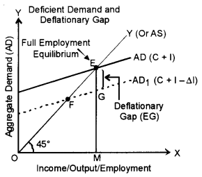 (iii) Due to a decrease in investment expenditure (ΔI), aggregate demand falls from AD to AD1. It denotes the situation of deficient demand and the gap between them, i.e., EG is termed as a deflationary gap.