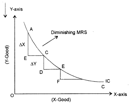 (ii) Indifference curves are convex to the origin: This property is based on the principle of diminishing marginal rate of substitution. It implies that as the consumer substitutes X for Y, the marginal rate of substitution between them goes on diminishing as shown in the following figure.