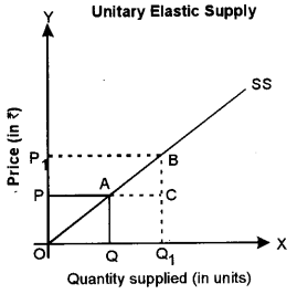 (ii) Unitary Elastic Supply (Es = 1): If the straight-line supply curve passes through the origin (supply curve SS in fig.), then elasticity of supply will be equal to one. In the diagram, Elasticity of Supply (Es) = \(\frac { OQ }{ OQ }\) = 1. Hence, the supply is unitary elastic.