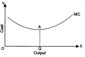 (x) MC curve is U-shaped. As output increases, MC curve slopes downward (up to OQ units), reaches the minimum (at point A) and then starts sloping upward beyond OQ level of output. (See Fig.) The U-shape of MC curve is because of the law of ( variable proportions. It is negatively sloped in the initial stage of production due to increasing returns to the variable factor and is positively sloped thereafter due to decreasing returns to the variable factor.