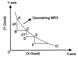 (ii) Indifference curves are convex to the origin: This property is based on the principle of diminishing marginal rate of substitution. It implies that as the consumer substitutes X for Y, the marginal rate of substitution between them goes on diminishing as shown in the following figure.