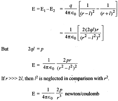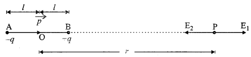 Let E1 and E2 be the magnitudes of the intensities of the electric dipole at ‘P’ due to the charges + q and -qof the dipole respectively. The distance of the point P from the charge +q is (r – l) and that from the charge – q is (r + l). Therefore,