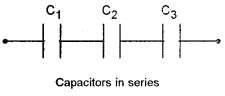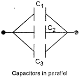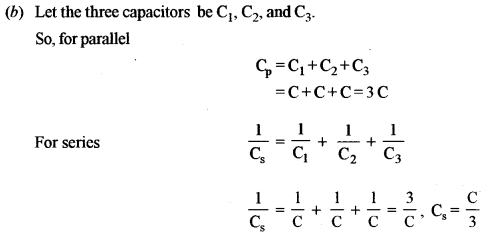 (b) Three capacitors each of capacitance C are connected in series. Their equivalent capacitance is Cs. The same three capacitors are now connected in parallel. Their equivalent capacitance becomes Cp. Find the ratio \(\left(\frac{\mathrm{C}_{\mathrm{p}}}{\mathrm{C}_{\mathrm{s}}}\right)\) (Working must be shown) [3]