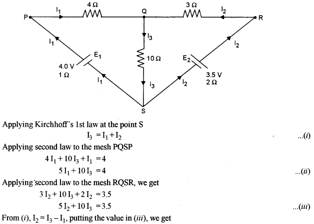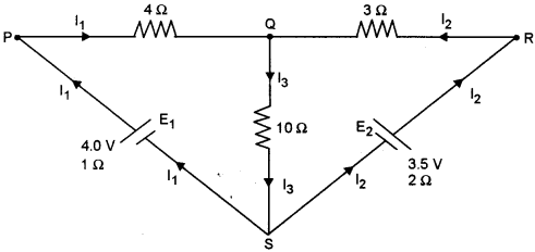 (a) In the circuit shown below in figure, E1 and E2 are batteries having emfs 4.0 V and 3.5 V respectively and internal resistance 1 Ω and 2 Ω. respectively. Using Kirchhoff’s laws, calculate currents : I1 I2 and I3. [4]