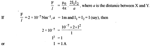 (c) How much force per unit length acts on a long current carrying conductor X due to a current flowing through another similar conductor Y, kept parallel to it in vacuum ? [2]