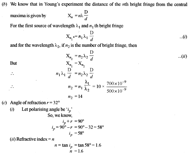 (c) A certain monochromatic light travelling in air is incident on a glass plate at a polarizing angle. Angle of refraction in glass is found to be 32°. Calculate : [2]