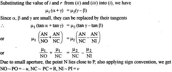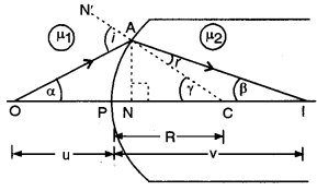 (b) Let O be a point object in the rarer medium of refractiive index μ1 and lying on the principal axis. The image of this object. O is formed by refraction at the convex spherical surface of radius at the point I into the medium B of refractive index μ2 of curvature as shown in the fig. The convex surface has a small aperture and the angles of incidence z and refraction r are small.