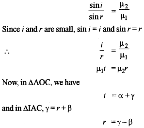 From A, draw AN perpendicular to principal axis. For refraction at the point A, by Snell’s law, we have