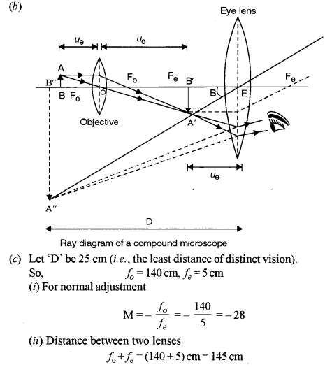 (b) Draw a labelled diagram of an image formed by a compound microscope with image at least distance of distinct vision. [3]