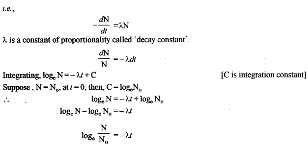 Let ‘N’ be no. of atoms present in radioactive substance at any instant ‘t’. Let dN be the no. that disintegrates in a short interval ‘dt’. Then, the rate of disintegration -dN/dt is proportional to N,