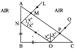 (viii) A ray of light LM incident normally on the surface AC of an isosceles right angled prism ABC (where AB = BC) emerges along PQ, parallel to LM, as shown in figure below: