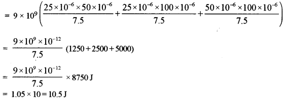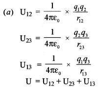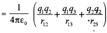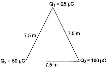 (a) Three point charges Q1 = 25 μC, Q2 = 50 μC and Q3 = 100 μC, are kept at the comers A, B and C respectively of an equilateral triangle ABC having each side equal to 7.5 m. Calculate the total electrostatic potential energy’ of the system. [4]