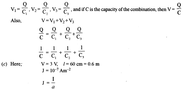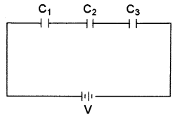 (b) In the figure are shown, three capacitor of capacity C1, C2 and C3 in series. In this case, the charge Q flowing through each of the capacitors is the same but difference across them is different. Let V be the potential difference of the battery and V1, V2 and V3 be the potential difference across them respectively. Then