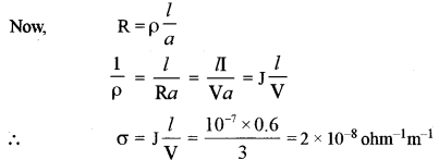 (c) When a potential difference of 3 V is applied between the two ends of a 60 cm long metallic wire, current density in it is found to be 1 x 10-7 Am-2 . Find conductivity of the material of the wire in SI system. [2]