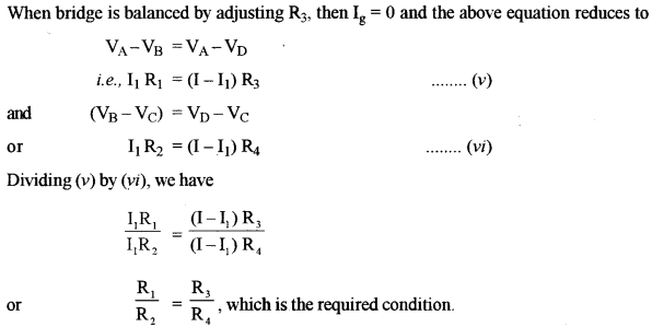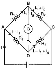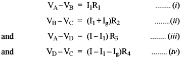 (b) In the figure is shown an unbalanced Wheatstone bridge. A current Ig flows from D to B i.e., D is at a higher potential. Let VA, VB, VC, and VB be the potential at the points A, B, C, and D respectively, then by applying Ohm’s law, we have