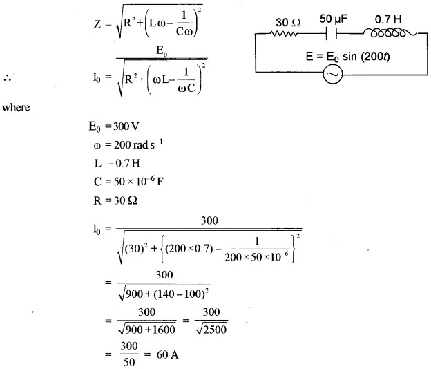(c) A 50 μF capacitor, a 30 Ω resistor and a 0.7 H inductor are connected in series to an ac supply which generates and emf ‘e’ given by e = 300 sin (200 t) Volt. Calculate peak value of the current flowing through the circuit. [4]