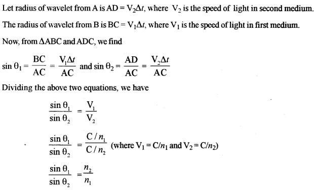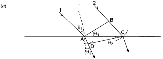 We focus our attention on the instant ray 1 strikes the surface and subsequent time interval. Until ray 2 strikes the surface. During this time interval, the wave at A send out a Huygens’s wavelet towards D. In the same time interval, the wave at B sends out Huygens’s wavelet towards C. Since two wavelets travel through different mediums, thus radii of the two wavelets are different.