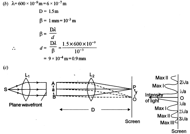 (b) In Young’s double slit experiment using monochromatic light of wavelength 600 nm, interference pattern was obtained on a screen kept 1.5 m away from the plane of the two slits. Calculate the distance between the two slits, if fringe separation/fringe width was found to be 1.0 mm. [2]
