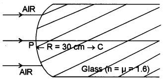(c) Figure below shows a parallel beam of monochromatic light incident on a convex spherical surface, radius of curvature R = 30 cm, which separates glass (refractive index = 1.6) from air. Find the position of the image formed due to refraction of light at this single spherical surface.