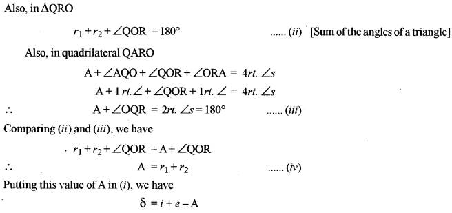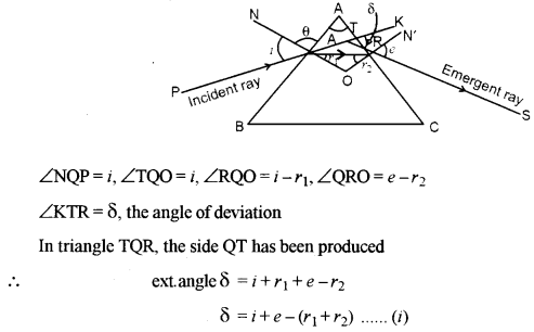 (b) In the figure is shown, a ray light PQ incident at an angle i on the face AB of a prism ABC. This ray is refracted along QR at an angle r1. This refracted ray is incident on the face AC at an angle r2 and emerges along RS at an angle e. Angle of deviation is the angle between the incident ray produced forward and emergent ray produced backwards. Clearly,