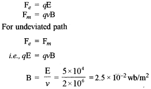 ii) The electron will experience a force in the upward direction due to the electric field in the plane of the paper. Since the electron passes undeviated, the force due to the magnetic field will be in the downward direction. The direction of the: force on the electron will be in the down ward only if B is directed downward perpendicular to the plane of paper