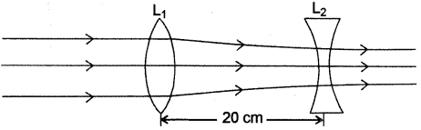 (ix) A thin convex lens (L1) of focal length 80 cm and a thin concave lens (L2) of focal length f are kept co-axially, 20 cm apart as shown in figure below. When a narrow and parallel beam of light is incident on the convex lens, beam emerging from the concave lens is also a parallel beam Find f.