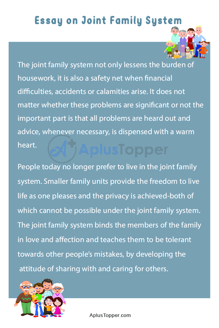Joint Family System Essay: The joint family system is the traditional family system. This family system has been prevalent in India since ancient times. Under this system, the entire family grandparents (paternal) and their male children with their families stay under a single roof. Each member of the family shares the household chores, thus the work is divided and the burden of the work is lessened.