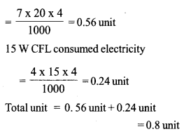In a house 7 CFL Lamps each of 20W, 4 CFL Lamps each of 15 W works for 4 hours daily. What will be the consumption of electricity per day.