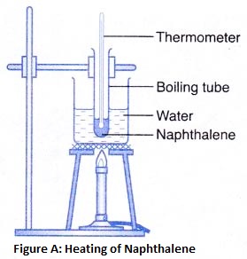 - The boiling tube is suspended in a beaker half-filled with water using a retort stand and a clamp as shown in Figure A. The level of naphthalene in the boiling tube is ensured to be below the level of water in the beaker.
